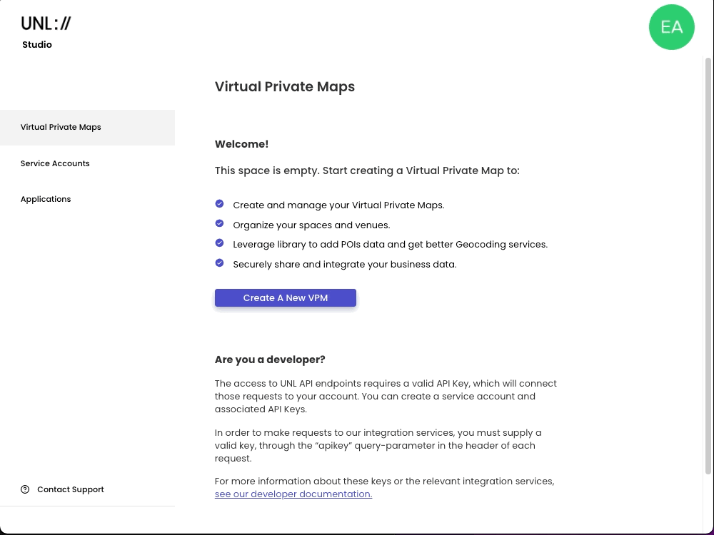 The next step is to create your virtual private map (vpms) from the Virtual Private map page and clicking on 'Create a VPM' to create your VPM. Alternatively, you can directly visit the page using the link https://studio.unl.global/vpms and click on Create A New VPM to create & name your map.